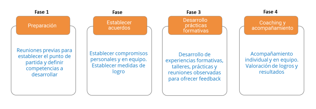 El plan de trabajo habitualmente lo diseñamos con un alcance de seis meses. Realizamos cinco laboratorios de aprendizaje, seis sesiones de coaching individual y por lo menos, cuatro sesiones observadas de equipo que se diseñan con el propósito de brindar feedback al líder y a los integrantes, fortaleciendo sus prácticas y el logro de los compromisos establecidos en la fase 1.