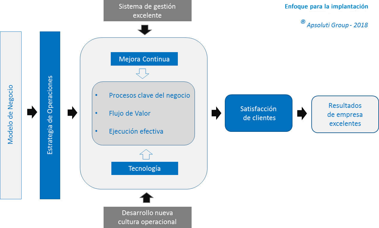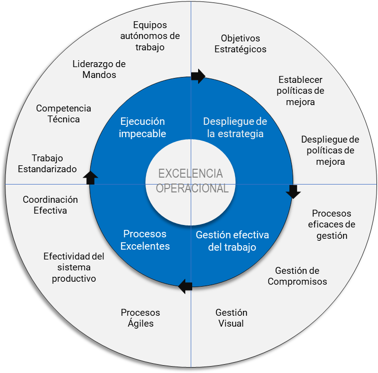 La Excelencia Operacional integra principios de dirección y organización centrada en el propósito, que permiten enfocar a todos los integrantes de la organización en aquellas prioridades que son críticas para la empresa en la obtención de resultados sobresalientes en un determinado período de tiempo. Además, contribuye a crear una cultura de disciplina operacional reconociendo la capacidad emprendedora de las personas, siendo la confianza, las conversaciones y la gestión centrada de compromisos los ejes centrales de la ejecución superior. El trabajo técnico de mejora continua de los procesos se realiza integrando diversas metodologías procedentes del TPM (Total Productive Management), Lean Management y Agile Process. Todo esto se pone en marcha construyecto equipos auto dirigidos, con capacidad para mejorar continuamente las actividades cotidianas del negocio.
