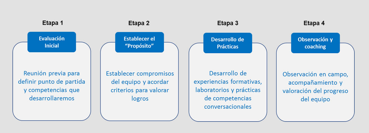 Proponemos realizar seis sesiones de entrenamiento en equipo y seis sesiones de coaching para los líderes junto con sus equipos para asegurar el desarrollo de las competencias sugeridas.